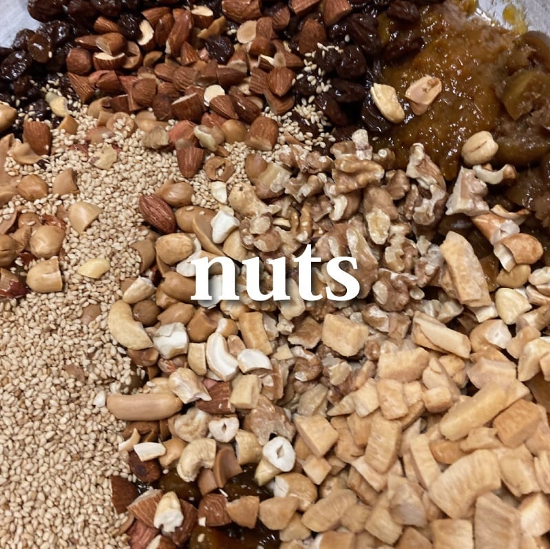 小麦粉・砂糖(三温糖・粉糖)・有機豆乳・蒲生産フルーツ(いちじく・梅・レモン・オレンジ・ゆず・金柑)・レーズン(米国)・いちじく(トルコ)・落花生(姶良産)・アーモンド(米国)・カシューナッツ(インド)・胡桃(米国)・ココナツ(マレーシア)・リキュール・有機ココナツオイル・米油・胡麻・天然酵母・香辛料・塩